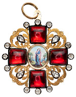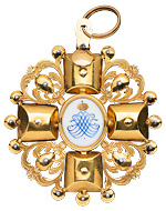 Знак ордена Святой Анны 1-й степени. С.-Петербург, начало XIX в. Мастерская А.В.Панова. Клейма: на ушке с лиц. ст. знака ордена – городское С.-Петербурга, на об. ст. знака ордена вверху – именное клеймо «A·P». Золото, серебро, эмаль, стекло, 57,23 г. Размеры 79,0 х 66,7 мм. Сохранность отличная. Исключительно редкий.