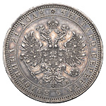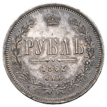 1 рубль 1863 года, СПБ-АБ. Серебро, 20,61 г. Сохранность почти отличная, мелкие засечки по полю. ГМ# 9.2. Severin# 3742 (черта с точкой). Уздеников# 1812 (черта с точкой). Биткин# 75 (R2). Очень редкий, 25 рублей по Ильину.