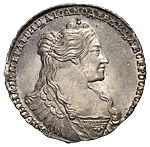 Полтина 1735 года. Лиц. ст.: портрет с кулоном на груди, в начале легенды двоеточие. Об. ст.: крест державы узорчатый. Серебро, 13,05 г. Сохранность превосходная, прекрасный штемпельный блеск. ГМ# нет. Severin# 1202. Уздеников# 0724. Дьяков# 3. Биткин# нет. Редкая, 3 рубля по Петрову.