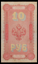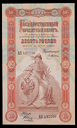Государственный Кредитный Билет 10 рублей 1894 года, АП 427756. Сохранность очень хорошая. Кардаков# I.1.650 (7,5 дойчмарок). Денисов# К-22. Рябченко# 560. Редкий.