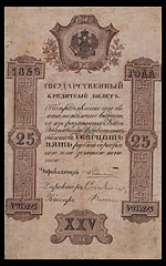 Государственный Кредитный Билет 25 рублей 1856 года, № 935283. Сохранность очень хорошая, реставрация по краю. Кардаков# I.1.454 (30 дойчмарок). Денисов# К-5.5. Рябченко# 412 (Р). Очень редкий.