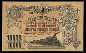 Общество Владикавказской железной дороги, выпуск из 5,4 % сроком на 2 года. Заемный Билет 10000 рублей 1919 года, А 1237. Бона в пластиковой капсуле (слабе) PMG, 55 About Uncirculated. Кардаков# VII.12.7 (75 дойчмарок). Рябченко# 5517 (Р). Очень редкий.