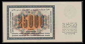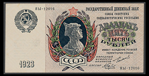 Государственный Денежный Знак 25000 рублей 1923 года, ЯЫ 12016. Бона в пластиковой капсуле (слабе) PMG, 64 Choice Uncirculated. Кардаков# I.4.303 (1,5 дойчмарки). Денисов# КЗ-62. Рябченко# 1322.