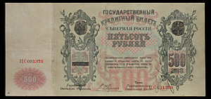 Эмиссионная касса Английского банка в г. Архангельске «СЕВЕРНАЯ РОССИЯ». Государственный Кредитный Билет 500 рублей 1918 года, ЦС 031378. На аверсе билета орлы с коронами заштемпелеваны. Сохранность очень хорошая. Кардаков# II.1. 29 (120 дойчмарок). Рябченко# 2052. Исключительно редкий.