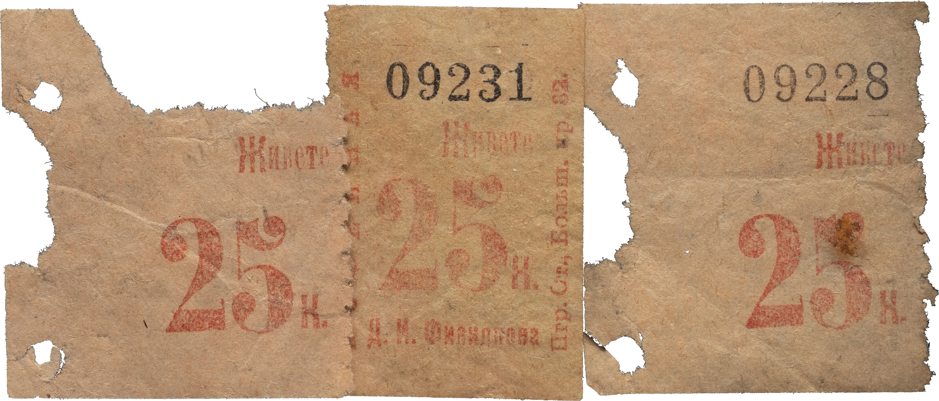 Придворный Поставщик Д. И. Филиппов. Номерные марки. 25 копеек н/д, 09228, 09231, «Кофейная». 3 экземпляра. Сохранность очень хорошая. (3)