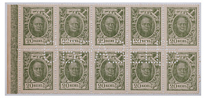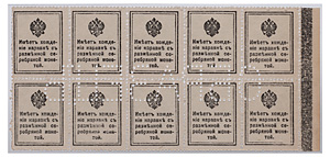 Марки-деньги Императорской России. 20 копеек (1915 года). Фрагмент листа, 10 экземпляров, с горизонтальной перфорацией слова «ОБРАЗЕЦЪ». Бона в пластиковой капсуле (слабе) PMG, 65 Gem Uncirculated EPQ. Кардаков# I.1.722. Денисов# К-52. Рябченко# 729. (10)