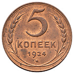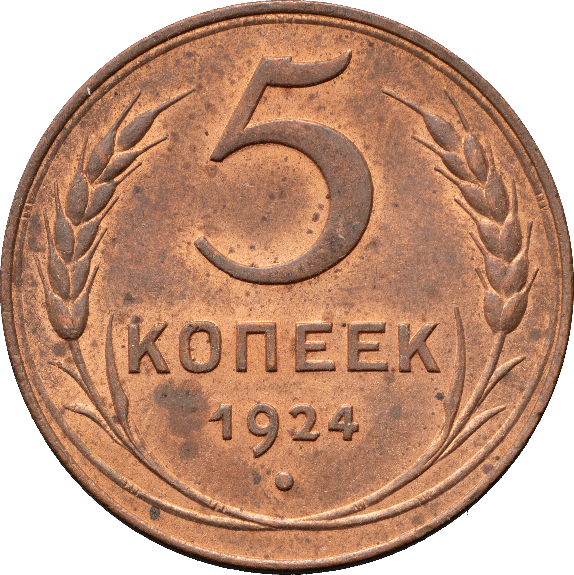 5 копеек 1924 года. Лиц. ст.: шт. 1.1 — з. ш. выпуклый, сетка тонкая, серп узкий. Гурт гладкий. Медь, 16,32 г. Сохранность отличная, лёгкая патина, штемпельный блеск. ФедоринVI# 1.