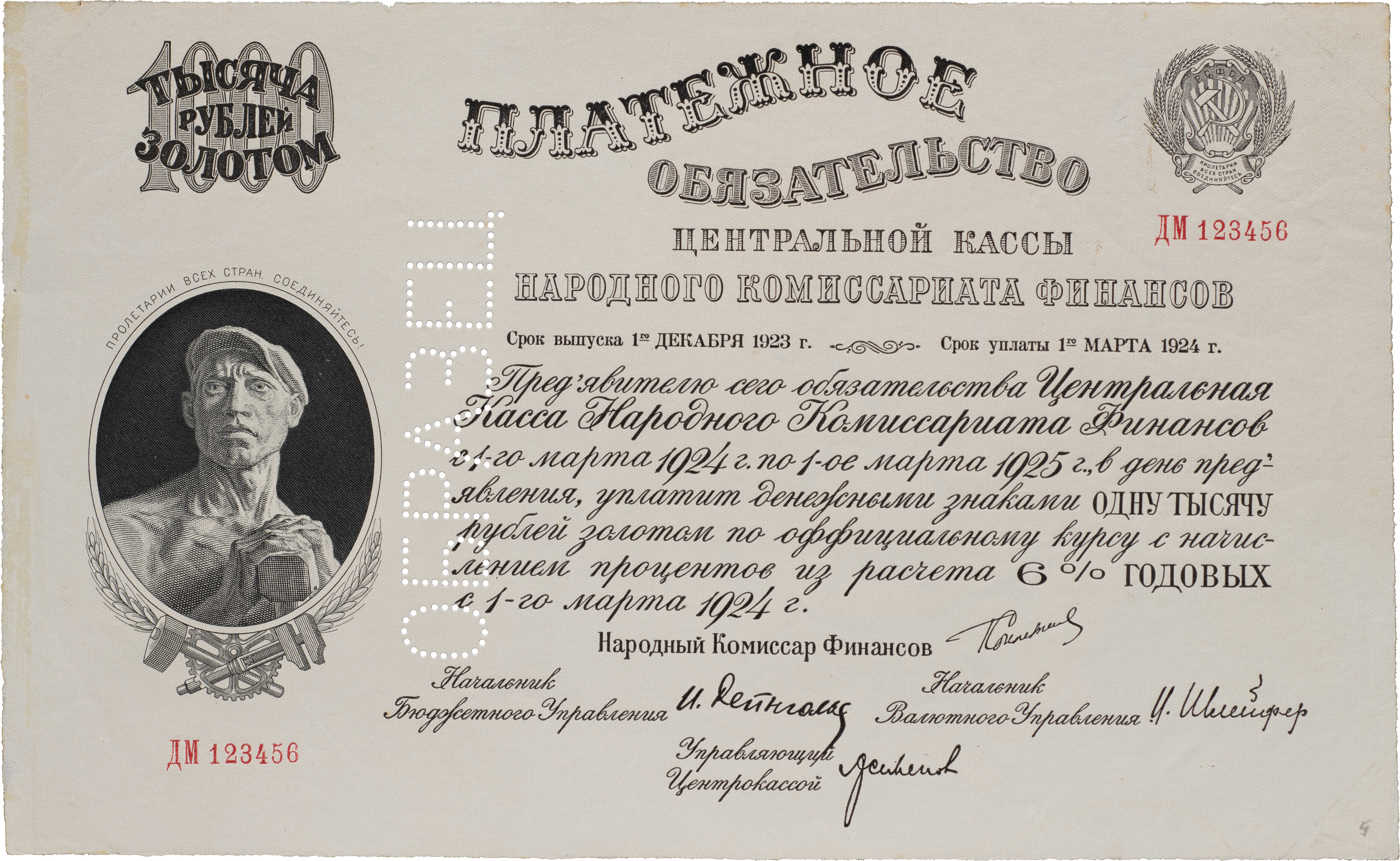 РСФСР. Платежное Обязательство центральной кассы Народного Комиссариата Финансов. 1000 рублей золотом 1923 года, ДМ 123456. «Образец». Сохранность почти отличная. Вертикальная перфорация слова «ОБРАЗЕЦ» в левой части купюры, снизу вверх. Кардаков# I.4.297 (25 дойчмарок). Денисов# ПЛ-4. Рябченко# 1317. Очень редкое.