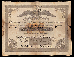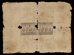 Государственная Ассигнация 10 рублей 1835 года, № 88441. Сохранность очень хорошая, внизу по краю утеря участка поля. Кардаков# I.1.347 (20 дойчмарок). Денисов# А-11.12. Рябченко# 315 (Р). Очень редкая.
