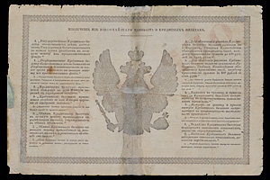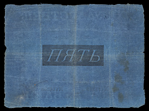 Государственный Кредитный Билет 5 рублей 1843 года, б/№ . «Образец». Без водяного знака. Сохранность очень хорошая, левый край билета восстановлен. Кардаков# I.1.409 (12 дойчмарок). Денисов# К-3.1. Рябченко# 369 (РРР). Очень редкий.