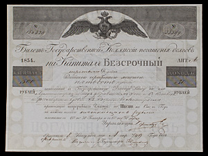 Государственная комиссия погашения долгов. Билет на капитал бессрочный в 500 рублей, третьего 6% займа российской серебряной монетой, записанный в Государственную долговую книгу на имя Администрации под управлением Гопе и Ко, Кетвиха и Фоомберга и вдовы В. Борски в Амстердаме. 1854 г. Лит. А., № 156329, № 33594. Сохранность отличная.