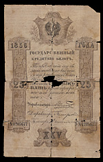 Государственный Кредитный Билет 25 рублей 1856 года, № 1205677. Сохранность хорошая. Кардаков# I.1.454 (30 дойчмарок). Денисов# К-5.5. Рябченко# 412 (Р). Очень редкий.