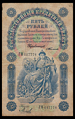 Государственный Кредитный Билет 5 рублей 1898 года, ГМ 017778. Подписи: управляющий Тимашев, кассир Михеев. Сохранность очень хорошая. Кардаков# I.1.688 (2,5 дойчмарки). Денисов# К-26.2. Рябченко# 703а. Довольно редкий.