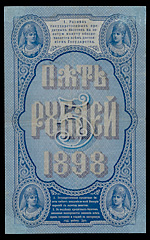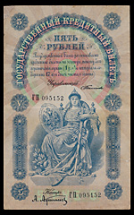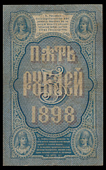 Государственный Кредитный Билет 5 рублей 1898 года, ГП 095152. Подписи: управляющий С. Тимашев, кассир Афанасьев. Сохранность очень хорошая. Кардаков# I.1.688 (2,5 дойчмарки). Денисов# К-26.2. Рябченко# 703а. Довольно редкий.