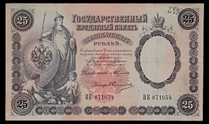 Государственный Кредитный Билет 25 рублей 1899 года, ВБ 871054. Подписи: управляющий Тимашев, кассир Овчинников. Сохранность очень хорошая. Кардаков# I.1.692 (2,5 дойчмарки). Денисов# К-30.2. Рябченко# 707а. Редкий.