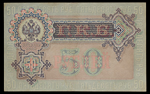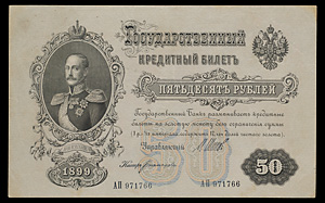 Государственный Кредитный Билет 50 рублей 1899 года, АП 971766. Подписи: управляющий И. Шипов, кассир Богатырев. Сохранность почти отличная. Кардаков# I.1.708. Денисов# К-31. Рябченко# 708в.