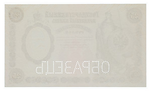 Государственный Кредитный Билет 25 рублей 1899 года, «Образец» без подписей и номера. Два односторонних оттиска аверса и реверса. Боны в пластиковых капсулах (слабах) PMG: 65 Gem Uncirculated, EPQ и 64 Choice Uncirculated, EPQ. Кардаков# I.1.692 (2,5 дойчмарки). Денисов# К-30.2. Рябченко# 707а. Очень редкие. (2)