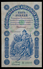 Государственный Кредитный Билет 5 рублей 1898 года, ББ 188097. Подписи: управляющий Э. Плеске, кассир Софронов. Сохранность очень хорошая. Кардаков# I.1.680 (2,5 дойчмарки). Денисов# К-26.1. Рябченко# 703. Довольно редкий.