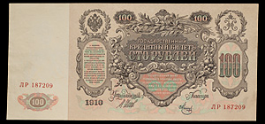 Государственный Кредитный Билет 100 рублей 1910 года, ЛР 187209. Подписи: управляющий Шипов, кассир Метц. Сохранность почти отличная. Кардаков# I.1.713. Денисов# К-36.2в. Рябченко# 713а.