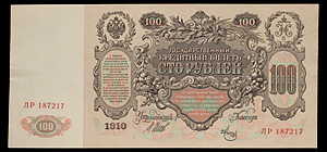Государственный Кредитный Билет 100 рублей 1910 года, ЛР 187217. Подписи: управляющий Шипов, кассир Метц. Сохранность почти отличная. Кардаков# I.1.713. Денисов# К-36.2в. Рябченко# 713а.