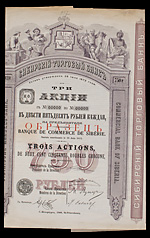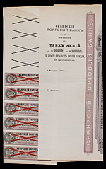 Сибирский Торговый Банк. «Образец». Три акции в 250 рублей каждая, 1909 года, с № 00000 по № 00000. Сохранность очень хорошая. Учрежден в 1872 году в Екатеринбурге группой уральских и сибирских горнопромышленников, многие из которых были тесно связаны с придворными кругами. В числе учредителей: граф П. А. Шувалов, генерал-майор П. П. Дурново, барон Г. Е. Гинцбург, золотопромышленник Н. Д. Бенардаки и др. Редкие.