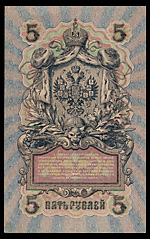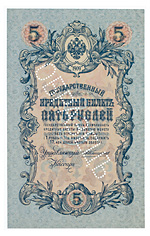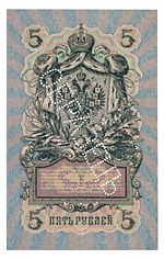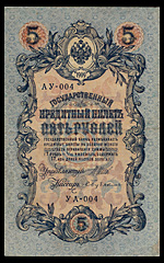 Государственный Кредитный Билет 5 рублей 1909 года, вверху АУ-004, внизу УА-004 — ошибка букв серии! Подписи: управляющий Шипов, кассир Бубякин. Сохранность очень хорошая. Кардаков# I.2.6а (R). Денисов# К-55.1а. Рябченко# 801а (Р). Очень редкий.