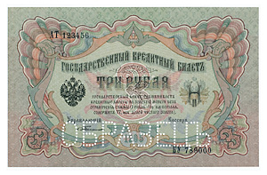 Государственный Кредитный Билет 3 рубля 1905 года, слева АТ 123456, справа БУ 789000. «Образец». Два односторонних оттиска аверса и реверса с подписью управляющего Государственного Банка С. Тимашева, без подписи кассира. На оттисках по горизонтали внизу, перфорационными отверстиями, нанесено слово «ОБРАЗЕЦЪ». Оттиски в пластиковых капсулах (слабах) PMG, 65 Gem Uncirculated, EPQ. Кардаков# I.1.687. Денисов# К-32.1. Рябченко# 709. Очень редкие. (2)