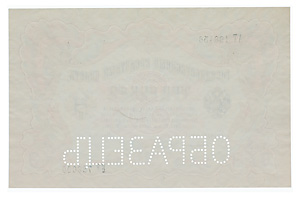 Государственный Кредитный Билет 5 рублей 1909 года, без номера, с подписью управляющего Коншина, без подписи кассира. «Образец». Два односторонних оттиска с диагональной перфорацией слова «Образецъ». Оттиск аверса в пластиковой капсуле (слабе) PMG, 65 Gem Uncirculated, EPQ. Оттиск реверса в пластиковой капсуле (слабе) PMG, 65 Gem Uncirculated, EPQ. Кардаков# I.1.702. Денисов# К-34.1. Рябченко# 710. (2)
