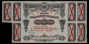 Билет Государственного Казначейства 3,6 %, в 50 рублей 1912 года, № 000000, с семью купонами. «Образец». Серия 434. Сохранность очень хорошая. Кардаков# I.4.2а (6 дойчмарок). Денисов# КБ-19.1. Рябченко# 1007. Крайне редкий.