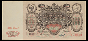 Государственный Кредитный Билет 100 рублей 1910 года, ВО 048467. С подписью управляющего А. Коншина, кассир Михеев. Сохранность очень хорошая. Кардаков# I.1.705 (1 дойчмарка). Денисов# К-36.1. Рябченко# 713.