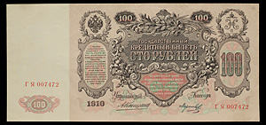 Государственный Кредитный Билет 100 рублей 1910 года, ГЯ 007472. С подписью управляющего А. Коншина, кассир Морозов. Сохранность очень хорошая. Кардаков# I.1.705 (1 дойчмарка). Денисов# К-36.1. Рябченко# 713.