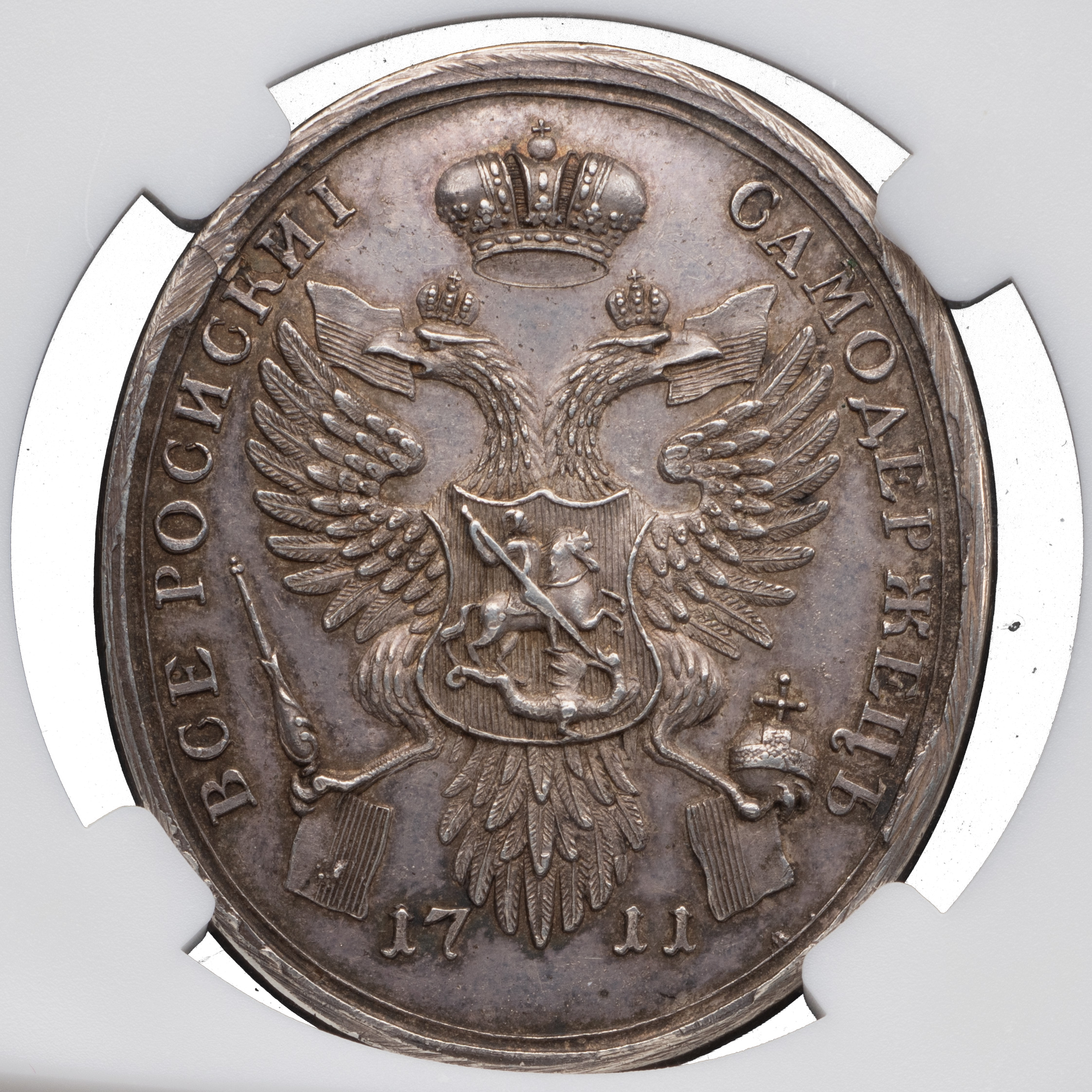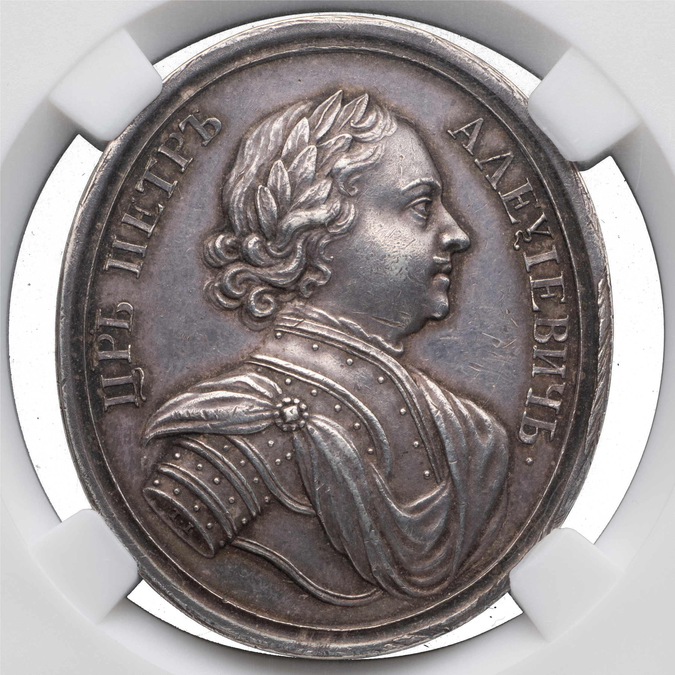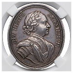 Медаль за Прутский поход 1711 г. (для народов Балканского полуострова), новодел. СПб монетный двор. Медальер лиц. ст. Т.И. Иванов (на обрезе изображения: Т.I.). Серебро; 32,65 г. (по сертификату). Соколов# 063.в.К (R3). Биткин# К176 (R2). Аналоги см. Смирнов# 196. Дьяков 40.2 (R2). Великие Русские победы в медали и гравюре# 403–405. Медаль в пластиковой капсуле (слабе) Национального нумизматического реестра, MS62, с сертификатом № WG5395. Редкая.
