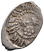 Великое княжество Рязанское. (1380–1390 гг.). Деньга. Надчекан на ордынском дирхеме. Лиц. ст.: тамга крупная, с изображением голов внутри. Об. ст.: тамга в ободке из штрихов. Серебро, 1,41 г. Сохранность очень хорошая, деформация края монеты.