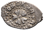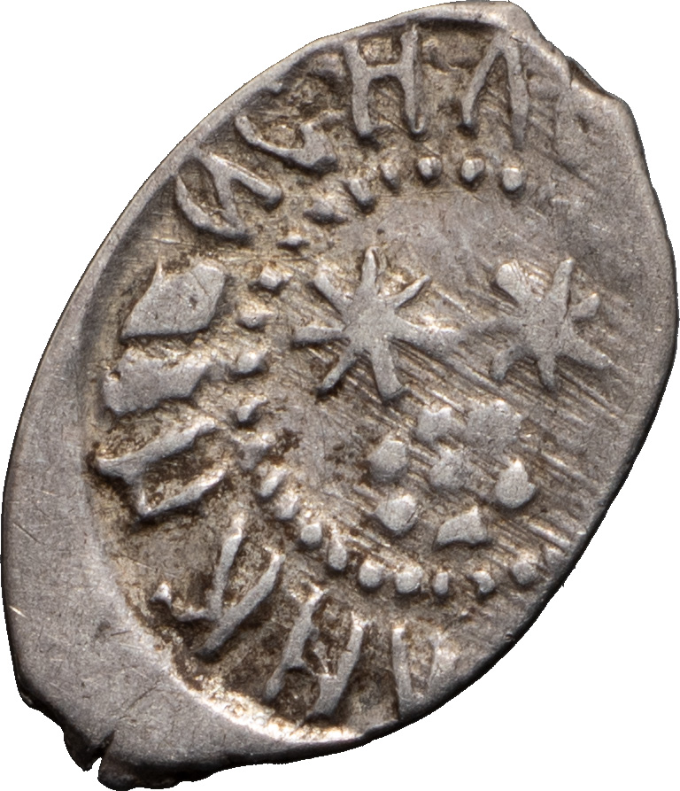 Великое княжество Московское. Василий II Темный (1425–1462). Деньга Московская (1450–1462). Лиц. ст.: две звездочки и розетка, круговая надпись: «КНЯЗЬ ВЕЛИКИI ВАСИЛЕI». Об. ст.: пятилепестковый цветок, круговая надпись: «*ДЕНГА МОСКОВСКАЯ». Серебро, 0,34 г. Сохранность почти отличная, приятная лёгкая патина, край монеты подрезан.
