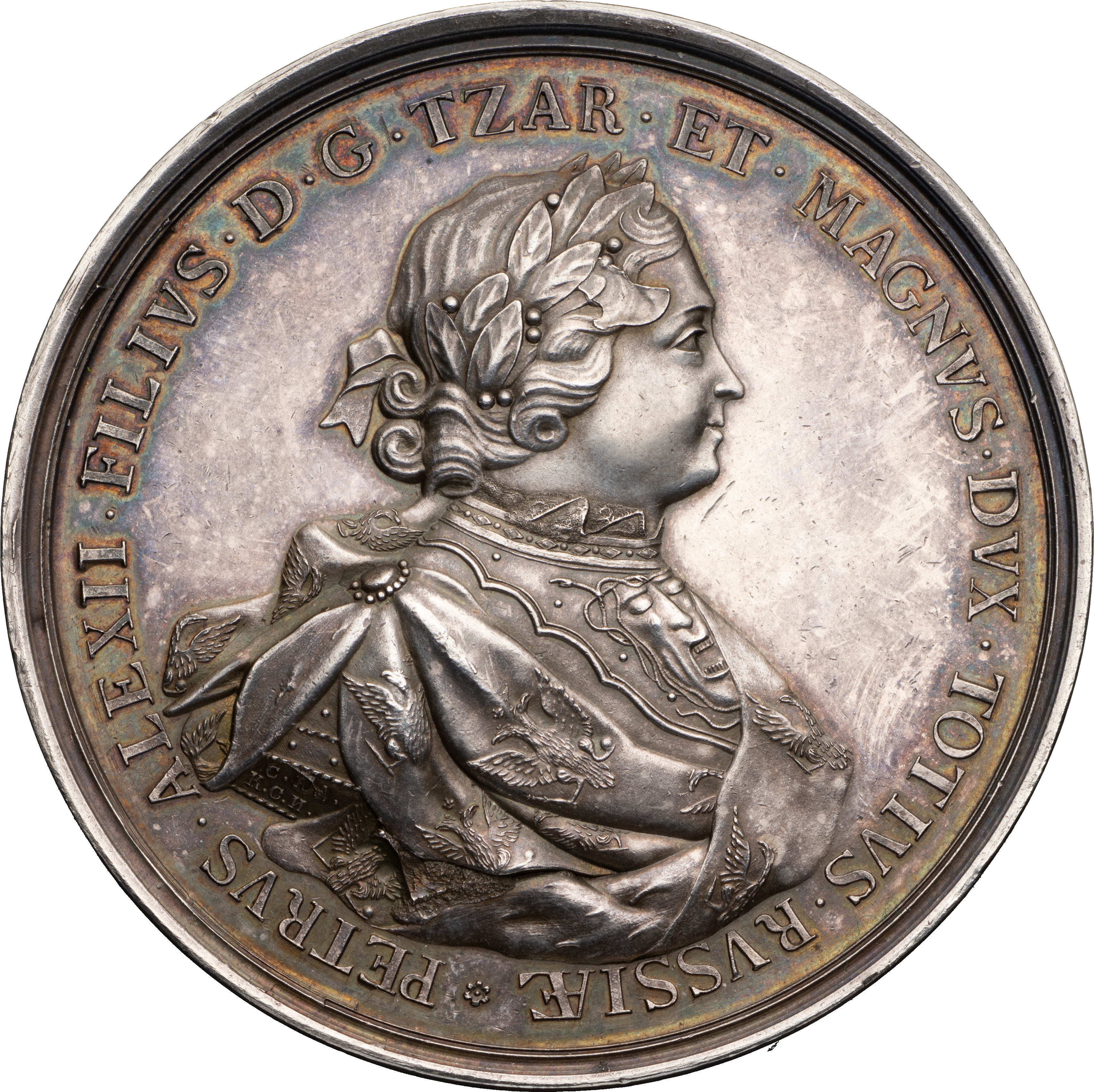 Медаль в память восшествия Петра I на престол, 27 апреля 1682 г. СПб монетный двор, XIX в. Медальеры: лиц. ст. — С. Иванов, копия работы С.Ю. Юдина (на обрезе изображения: С.ЮД. / К.С.И.) об. ст. — И.Г. Вехтер (слева над линией обреза изображения: I·G·W·). Серебро; 112,38 г. Диаметр 66,1 мм. Смирнов# 158б, сноска **. Соколов# 042.д.К. Аналоги см. Дьяков# 3. Великие русские победы, 1709, # 6. Сохранность отличная. Очень редкая.