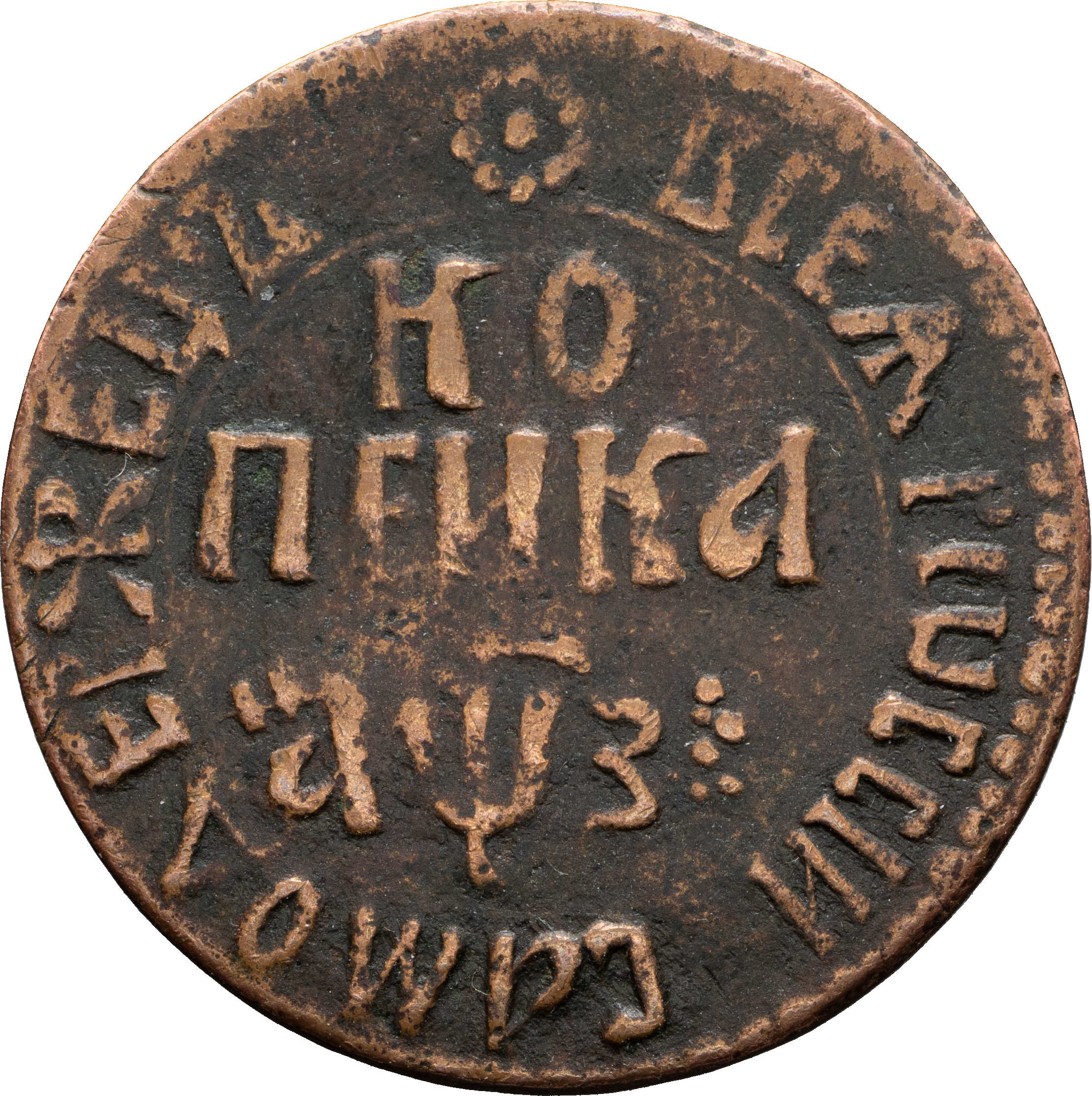 Копейка 1707 года, БК. Лиц. ст.: вверху розетка. Об. ст.: последняя буква даты продублирована точками. Медь, 7,87 г. Сохранность хорошая, тёмная рыхлая патина, следы чистки. ГМ# 32.22 (R). Уздеников# 2282 (точка). Дьяков# 61. ДьяковММ# 2349 (R3). Биткин# 1855 (R3). Очень редкая, 15 рублей по Ильину.