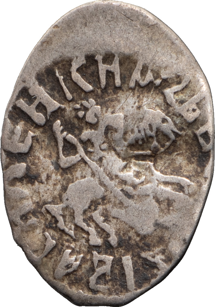 Великое княжество Московское. Василий II Темный (1425–1462). Деньга. Лиц. ст.: всадник с копьем влево, круговая надпись «КНЯЗЬ ВЕЛИКИЙ ВАСИЛИЙ». Об. ст.: всадник с саблей, под ногами коня змей, круговая надпись «ГОСПОДАРЬ ВСЕЯ РУCИ .... ». Серебро, 0,31 г. Сохранность очень хорошая, приятная патина.