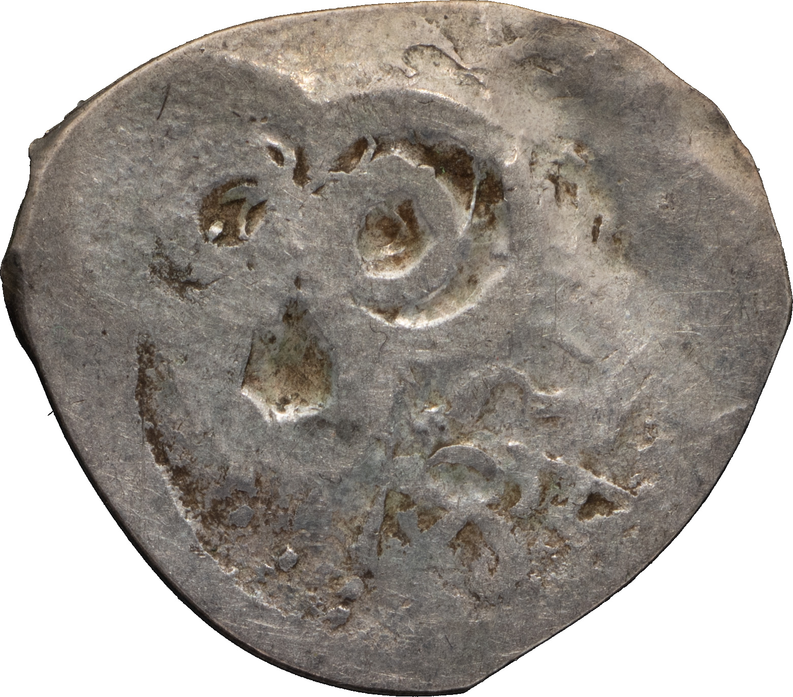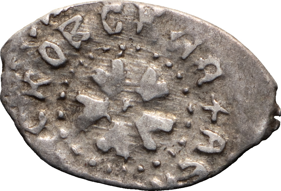 Великое Княжество Рязанское. Фёдор Ольгович (1402–1427 гг). Денга. Надчекан на подражании золотоордынскому дангу. Тамга без круговой надписи. Серебро, 1,17 г. Сохранность отличная, приятная патина.