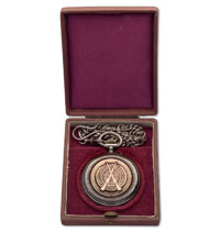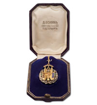 Часы карманные призовые за отличную стрельбу из винтовки (карабина), с цепочкой. Часы – Швейцария, Женева, 1895–1900 г. Фирма «Tobias», № 187556. Серебро, золото. Диаметр 55,5 мм. На циферблате портрет Великого Князя Константина Константиновича в чине генерал-майора. Надписи: на внутренней крышке, закрывающей механизм, вверху по окружности «ANCRE LIGNE DROITE» и ниже в четыре строки: «15 / PIERRES / Nickel / QTE TOBIAS»; на внутренней стороне верхней крышки в две строки (гравировка): «8 р. М. у. О. / Григорiю Суворову.». Клейма: пробирное Швейцарии для изделий из серебра 875-й пробы [медведь, стоящий на задних лапах, влево], малое, проба металла «84 / 0,875» в гербовом щите и именное «V. HENRI. LEUBA». К часам прилагается «Ручательство» на два года магазина часов «Генрих Кан» в С.-Петербурге (Загородный проспект, 40). Цепочка – Российская Империя, деревня Дербилки Сидоровской волости Костромской губернии, мастерская Н. В. Рукавишникова, 1908–1917 гг. Клейма на цепочке: Костромского окружного пробирного управления с пробой металла [тау, женская головка в кокошнике, вправо, 84] в овальном щитке; этого же управления в круглом щитке [женская головка в кокошнике, вправо, две точки за затылком]; именное клеймо «НВР» в овальном щитке. Серебро. Часы на ходу. Сохранность почти отличная, трещина на циферблате, стекло – пластмассовое. Часы с цепочкой вложены в оригинальную коробку. Часами был награжден младший унтер-офицер 8-й роты, видимо Лейб-гвардии Преображенского полка, Григорий Суворов. Великий Князь Константин Константинович (10.8.1858 – 2.6.1915), чей портрет помещен на циферблате часов, был вторым сыном Великого Князя Константина Николаевича и Великой Княгини Александры Иосифовны, приходился дядей Императору Николаю II. 23.4.1891 г. в чине полковника он был назначен командующим Лейб-гвардии Преображенским полком, а 6.12.1894 г. – произведен в генерал-майоры и утвержден в должности командира полка. Командовал полком до 4.3.1900 г., когда был назначен главным начальником военно-учебных заведений. Известны аналогичные призовые часы за отличную стрельбу из винтовки с портретами Императора Александра III и Великого Князя Михаила Александровича на циферблатах, также пожалованные нижним чинам Лейб-гвардии Преображенского полка. См. Вилков А. И. Призовые часы в Российской Императорской армии. М., 2004. С. 53, 54.