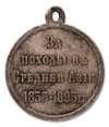 Медаль «За походы в Средней Азии 1853–1895 гг.». СПб монетный двор, 1896–1897 гг. Медальер М. Я. Габе. Серебро, 12,99 г. Диаметр 28,9 мм. Сохранность почти отличная, патина. Смирнов# 1109. Петерс# 195. Петерс 2005 #18. Учреждена 14 июля 1896 г. Серебряной медалью награждали: а) генералов, штаб и обер-офицеров, нижних чинов, как строевых, так и нестроевых всех родов войск и милиции, а также волонтеров, участвовавших в боевых действиях во время походов и экспедиций в Средней Азии с 1853 по 1895 год; б) священников, врачей, медицинских чиновников, санитаров и сестер милосердия, исполнявших свои обязанности во время боевых действий. Было отчеканено 20000 серебряных медалей.