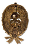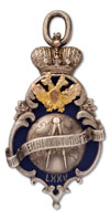 Знак для окончивших С.-Петербургский технологический институт Императора Николая I образца после 1896 года, фрачный. С.-Петербург, 1898–1904 гг. Неизвестный мастер, клеймо «Ф.Г.». Клейма на лицевой стороне знака внизу на концах ленты банта: справа – СПб окружного пробирного управления с пробой металла и инициалами управляющего пробирным округом Я. Н. Ляпунова в овальном щитке [84, женская головка в кокошнике, влево, ЯЛ]; слева – именное клеймо «Ф.Г.» в прямоугольном щитке; на закрутке два клейма: СПб окружного пробирного управления с инициалами управляющего пробирным округом Я. Н. Ляпунова в круглом щитке [женская головка в кокошнике, влево, ЯЛ] и именное клеймо «Ф.Г.» в прямоугольном щитке. Серебро, позолота, 8,85 г. Размеры 31,2 х 20,5 мм. Сохранность отличная. Патрикеев, Бойнович.1# 2.4. Утвержден 22.6.1896 г.