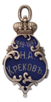 Жетон в память 75-летия Корпуса военных топографов. Российская Империя, 1897 г. Неизвестная мастерская. Без клейм. Серебро, золото, эмаль, 15,58 г. Размеры 40,8 х 23 мм. Сохранность отличная. Редкий. Принадлежал Н. А. Крекову. К жетону прилагается историческая справка о Н. А. Крекове, составленная научным сотрудником Омского областного музея истории народного образования Л. П. Полоницкой и коллекционером М. Е. Кокуниным. Корпус военных топографов был создан 28.1.1822 г. Креков Николай Авксентьевич (1857 – после 1921), топограф 2-го военного отдела Сибирского казачьего войска, служил в чине полковника, действительный член Западно-Сибирского отдела Императорского Русского Географического Общества, фотограф-любитель, классный военный топограф Корпуса Военных топографов, военный художник Омского Военно-Топографического отдела. 8.7.1873 г. принят на службу топографом. В 1873–1921 гг. служил в Западно-Сибирском Военно-Топографическом отделе (с 1882 г. – Омский ВТО), с 6.4.1893 г. производитель картографических работ, 5.6.1897 г. произведен в коллежские советники, с 17.4.1920 г. заведующий складом топографических карт и инструментов. Дальнейшая судьба не известна. В 1894–1911 гг. принимал активное участие в работе фотографической комиссии при Западно-Сибирском отделе Императорского Русского Географического Общества.