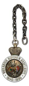 Жетон Михайловского Воронежского кадетского корпуса. Российская Империя, конец XIX в. Неизвестная мастерская. Без клейм. Серебро, позолота, эмаль, 15,60 г. Размеры 38 х 23,7 мм. Сохранность отличная. Петерс, Ильина# 266. Высочайше утвержден 11 марта 1895 г. в память 50-летия корпуса (1845–1895). Принадлежал Акишеву, окончившему корпус в 1875 г. На оборотной стороне жетона по окружности надпись буквами и цифрами синей эмали: «АКИШЕВЪ / * 1869–1875 *».