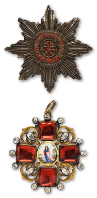 Лот из двух предметов: знака ордена Св. Анны 1-й степени и звезды ордена Св. Анны. Знак ордена Святой Анны 1-й степени. С.-Петербург, 1801–1815 гг. Неизвестная мастерская. Клейма: на оборотной стороне знака ордена на верхнем конце креста – городское (герб) С.-Петербурга; на ушке с лицевой стороны креста – два французских пробирных клейма для подержанных изделий из низкопробного золота с шифром г. Ниццы(?) «ET / n» в прямоугольном щитке. Золото, серебро, стекло, эмаль, 55,88 г. Размеры 78,6 х 72 мм. Сохранность отличная, незначительные царапины на стеклах нижнего и правого концов креста. Редкий. Звезда ордена Святой Анны. Российская Империя, начало XIX в. Неизвестная мастерская. Серебро, позолота, шелк, папье-маше, ткань, лак, 32,20 г. Размеры 82 х 82,4 мм. Сохранность почти отличная. Редкая.