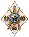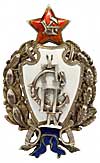 Знак для окончивших Первые Советские Петроградские кавалерийские курсы, IV выпуск. РСФСР, Петроград, 1922 г. 1-я Государственная ювелирная фабрика (бывшая «Эдуард»). Клейма: на оборотной стороне знака вверху на звезде – Петроградского окружного пробирного управления с пробой металла [альфа, женская головка в кокошнике, вправо, 84] в овальном щитке, два знака удостоверения [женская головка в кокошнике, вправо] в круглом и в квадратном щитках и клеймо 1-й Государственной ювелирной фабрики [эмблема «серп и молот» в круглом щитке]; на гайке – клеймо этого же пробирного управления в круглом щитке [женская головка в кокошнике, вправо, точка под подбородком] и клеймо «1я ГОС.ФАБРИКА». Серебро, позолота, эмаль, 35,13 г. Размеры 60,7 х 37,7 мм. Сохранность отличная. Нагрудные знаки СССР. С. 390. Аналог см. Селиванов М.С. Знаки отличия и различия эпохи Гражданской войны // Антиквариат, предметы искусства и коллекционирования. 2006. № 5 (37). С. 114–124. # 407. На подложке вверху гравировка в две строки: «Гальперину А.Я. / 28/IX 22». Очень редкий.