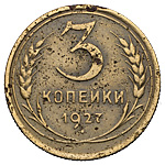 3 копейки 1927 года. «Перепутка». Лиц. ст.: шт. 1, 20 копеек 1924 г. — буквы СССР вытянуты. Бронза, 2,84 г. Сохранность очень хорошая, патина, коррозия. ФедоринVI# 15. Крайне редкие.