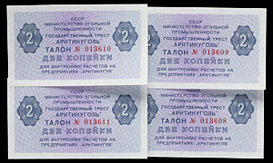 Министерство угольной промышленности. Государственный трест Арктикуголь на острове Шпицберген, 8-й выпуск (1979 г.). Талон 2 копейки (1979 года), 4 экземпляра (номера подряд). Сохранность отличная. Рябченко# 25232. (4)
