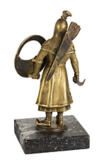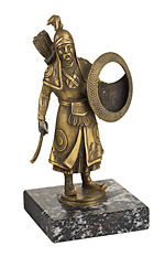 Западная Европа (?). Скульптор и фирма-изготовитель неизвестны, конец XIX - начало ХХ в. Бронза, литье, чеканка; мрамор. Размеры основания 78×78 мм. Высота 165 мм. Сохранность очень хорошая, вставной элемент щита утерян.