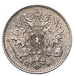 Для Финляндии. 25 пенни 1901 года, L. Серебро, 1,26 г. Сохранность очень хорошая, чистка. Уздеников# 4772. Биткин# 412. Holmasto99# 348. Казаков# 248.