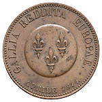 на Лиц. ст.: жетона — «AU PACIFICATEUR DE L’EUROPE. / PARIS.» (Миротворцу Европы / Париж), на Об. ст.: — «GALLIA REDDITA EUROPAE. / APRILE 1814.» (Франция возвращена Европе /